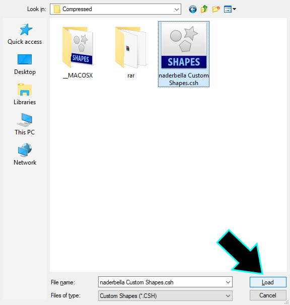 4. Cari file custom shape yang sudah diekstrak dan klik Load. Ratusan custom shape akan secara otomatis masuk ke kolom shape di Adobe Photoshop CS6.