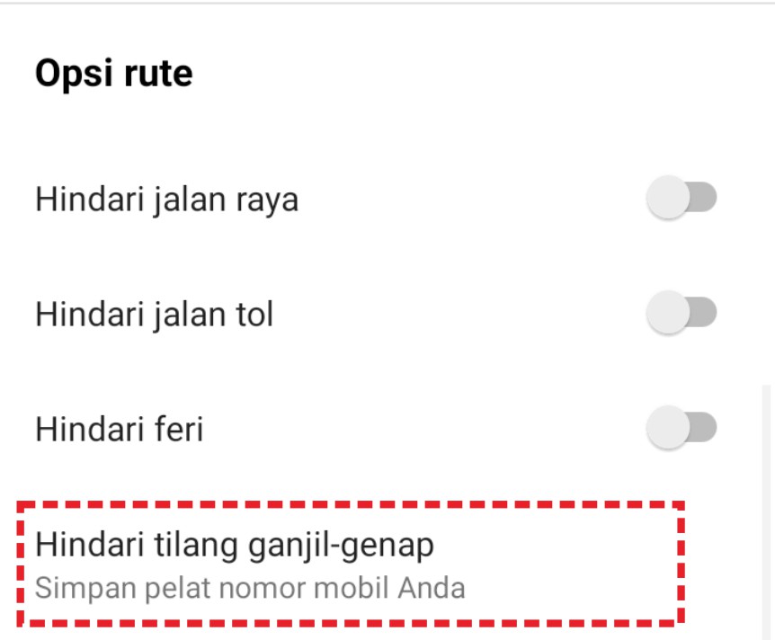 5. Pada menu setelah navigasi, salah satunya terdapat sub menu “opsi rute”. Pada bagian sub menu ini terdapat empat pilihan pengaturan. Pilih menu “hindari tilang ganjil-genap”,