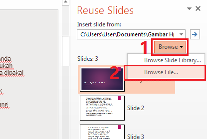 5. Maka akan muncul Tab di bagian pojok kanan, maka pilih Browse (1) dan Browse file atau Browse Slide Library (2).