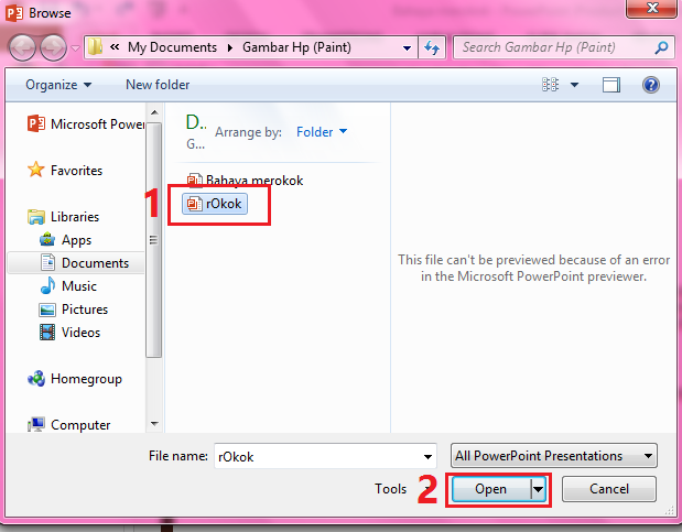 6. Cari file Power Point (1) yang ingin kamu gunakan ulang atau import slide dan klik Open (2).