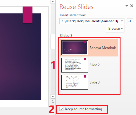7. Pilih salah satu atau berapapun slide yang ingin kamu gunakan ulang (1), jika kamu ingin format PowerPoint tersebut mengikuti format template yang sekarang kamu gunakan, maka jangan centang Keep source formatting namun jika kamu ingin menggunakan format template bawaan dari slide tersebut maka silahkan di centang (2).