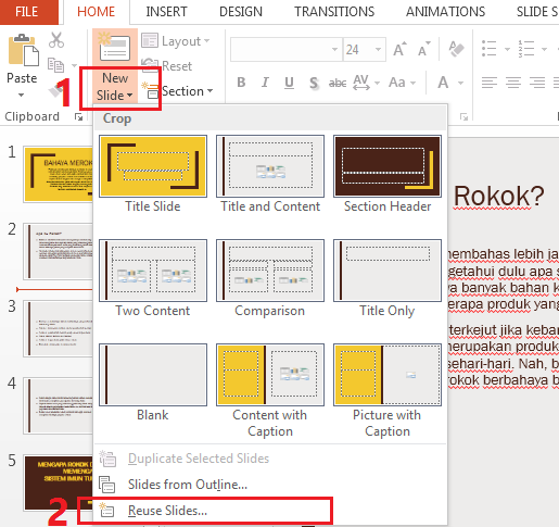 4. Setekah itu klik dropdown New slide (1) yang ada dibagian atas dan klik Reuse slides (2).