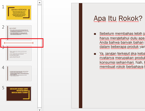 3. Pilih salah satu bagian yang ingin ditambahkan slide baru, yaitu dengan mengklik bagian antara penghubung slide yang ada di bagian kiri.