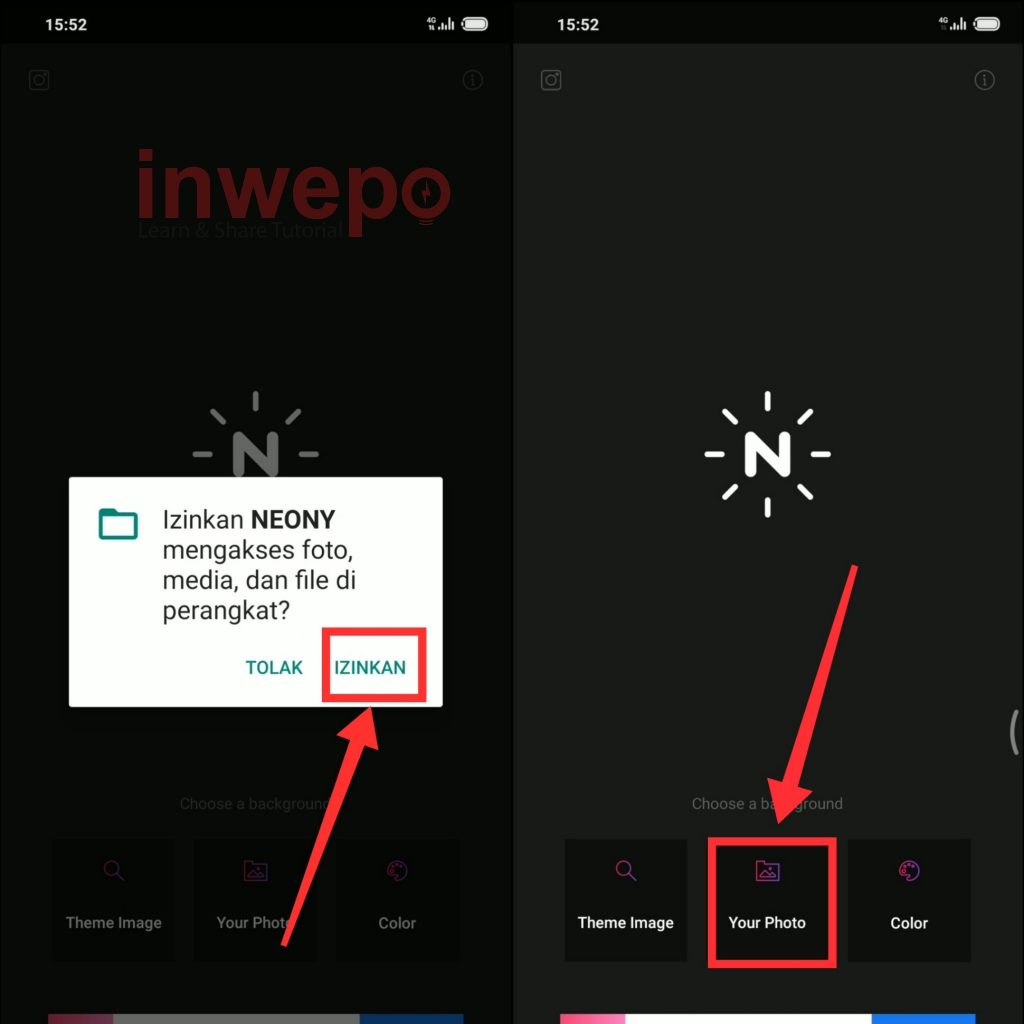 2. Langkah kedua, buka aplikasi kemudian tap Izinkan untuk memberi izin akses lalu tap Your Photo untuk menambahkan background foto dari galeri.