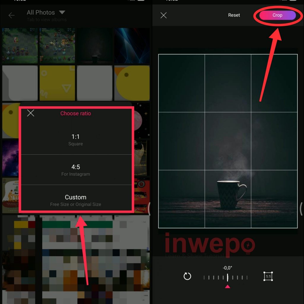 3. Langkah ketiga, pilih rasio yang akan kamu gunakan jika sudah selesai tap menu Crop di bagian atas untuk melanjutkan.