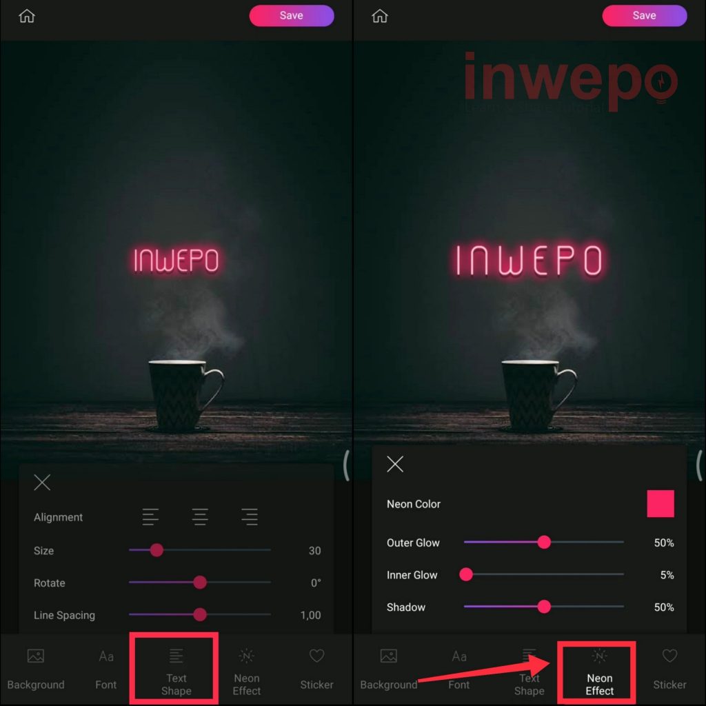 5. Langkah kelima, tap menu Text Shape untuk mengatur ukuran tulisan, rotasi dan lain-lain. Tap Neon Effect untuk mengganti warna neon, mengatur kecerahan dan juga bayangan.