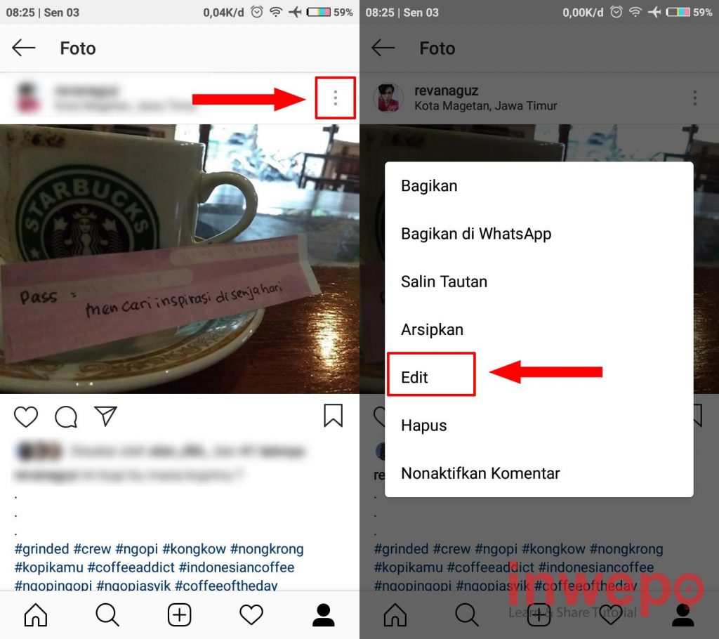 1. Langkah pertama, langsung pilih satu foto yang ada di profil Instagram kamu kemudian tap 3 titik yang berada di pojok kanan atas. Selanjutnya pilih menu Edit.