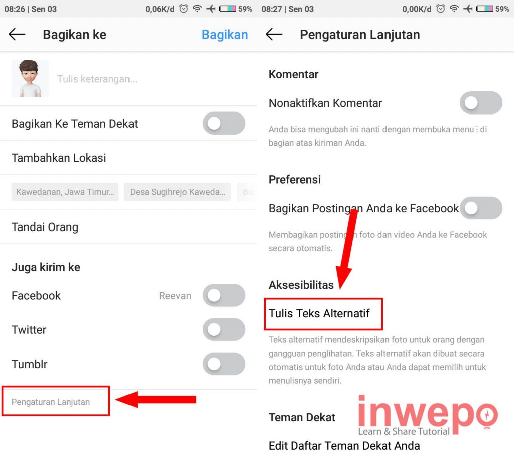 3. Langkah ketiga, untuk menambahkan alternative text sewaktu upload foto langsung tap Pengaturan lanjutan saat akan memberi keterangan dan caption pada foto yang akan di upload. Berikutnya pilih menu Tulis Teks Alternatif.
