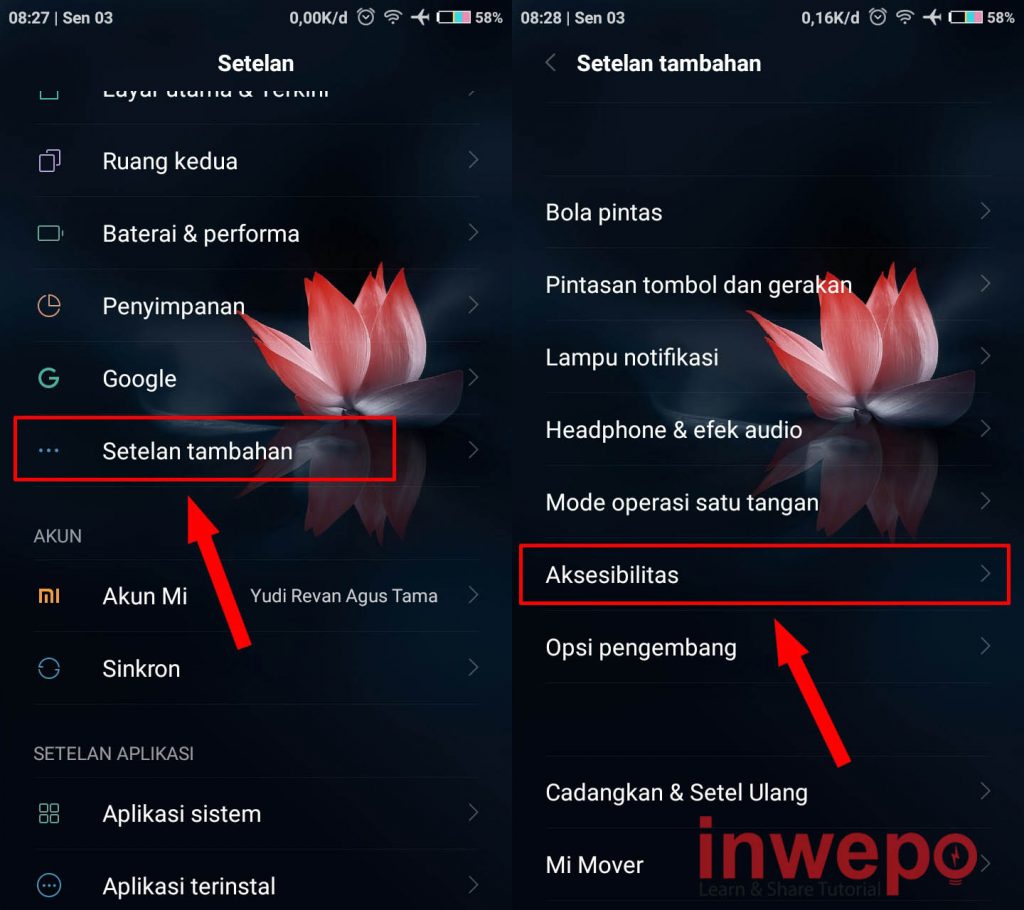 4. Langkah keempat, untuk mengujinya kita perlu mengaktifkan Android Accessibility Suite dengan cara masuk ke pengaturan. Lalu pilih Setelan tambahan lalu pilih menu Aksesibilitas.