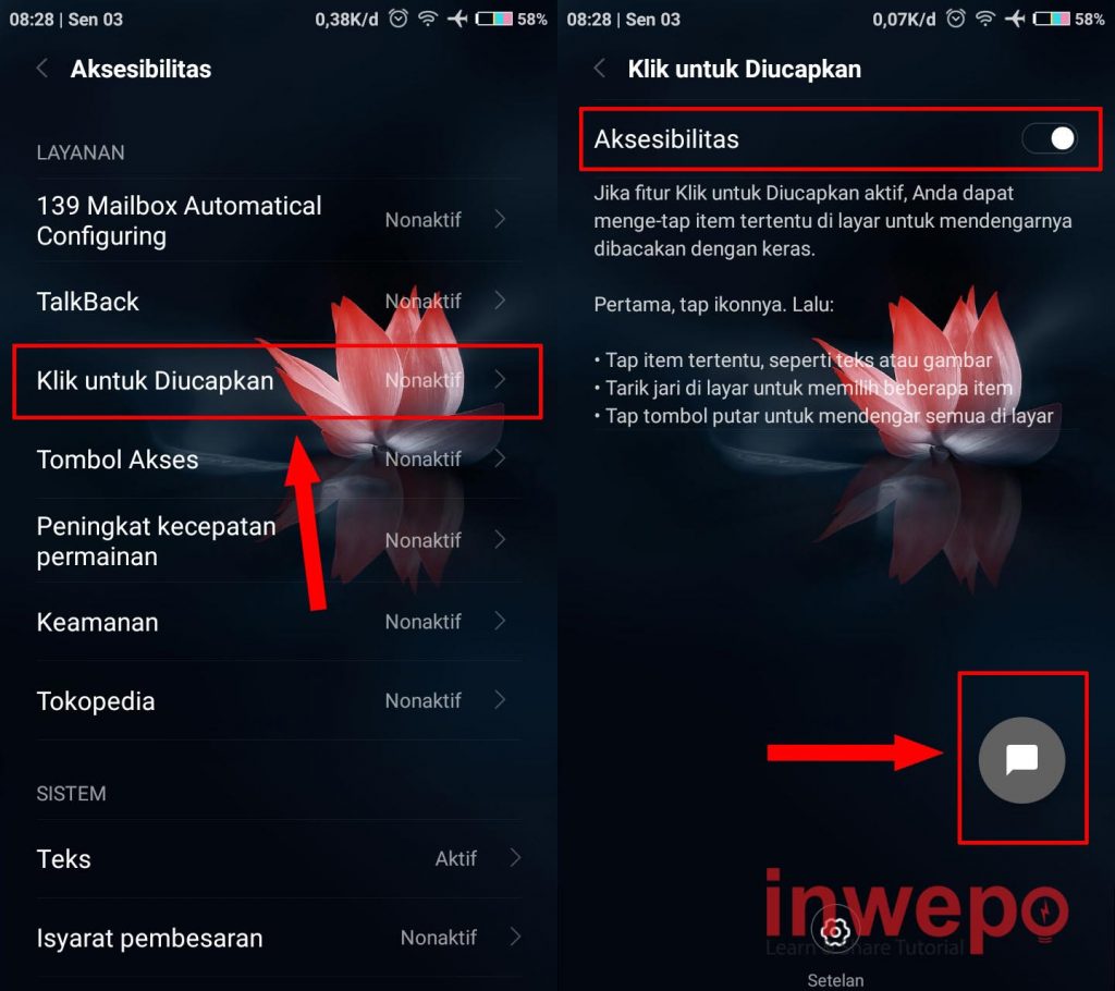 5. Tap Klik untuk Diucapkan kemudian aktifkan tombol Aksebilitas maka secara otomatis akan muncul icon gelembung di bagian bawah yang akan kita gunakan untuk membaca layar.