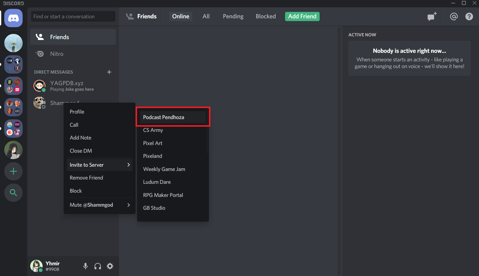 1. Klik kanan pada profil teman lalu klik “invite to server” dan klik server yang dinginkan.