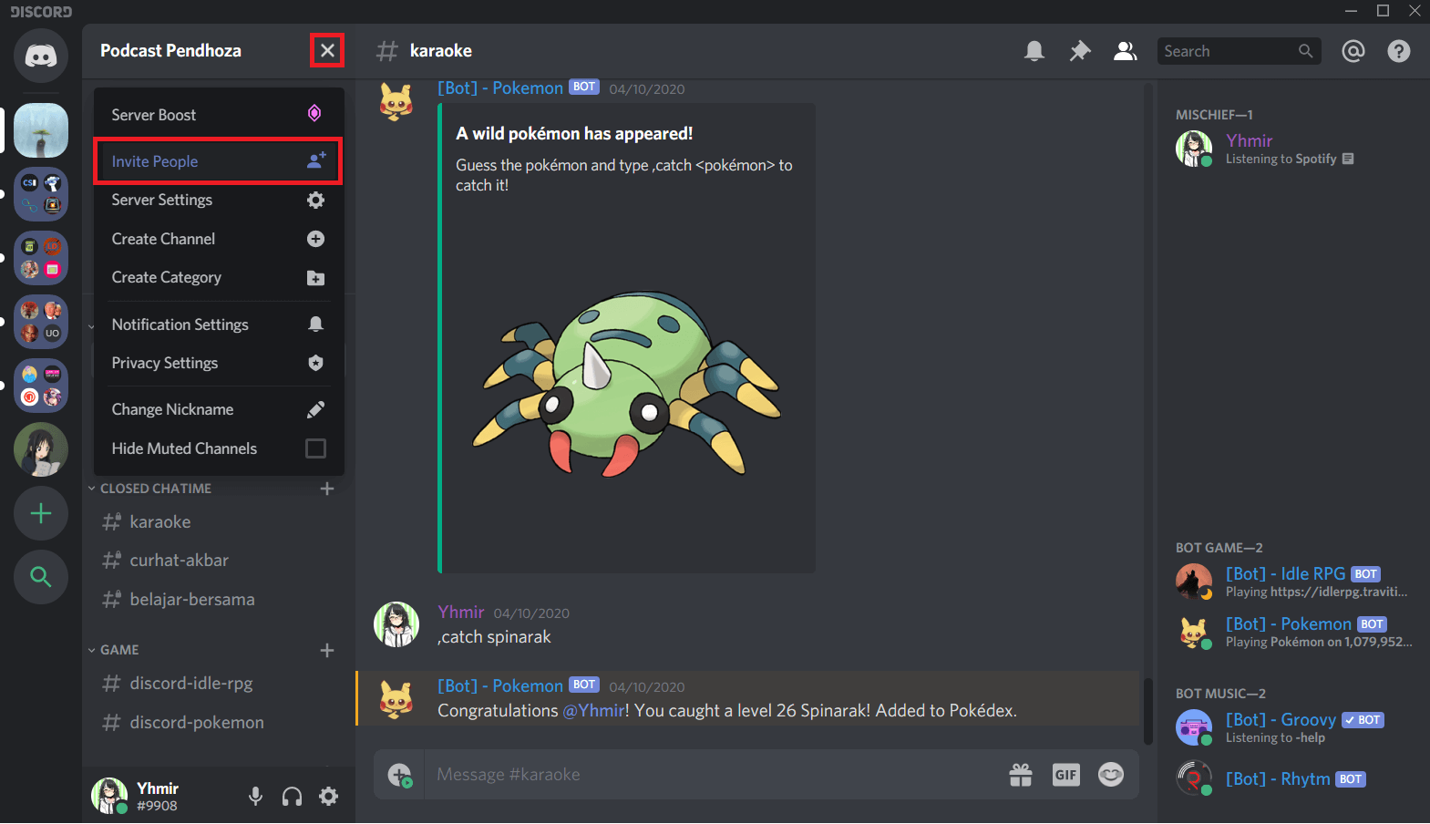 2. Klik tanda berbentuk V yang ada di sebelah nama server, pilih “Invite People” untuk melakukan proses invitasi.