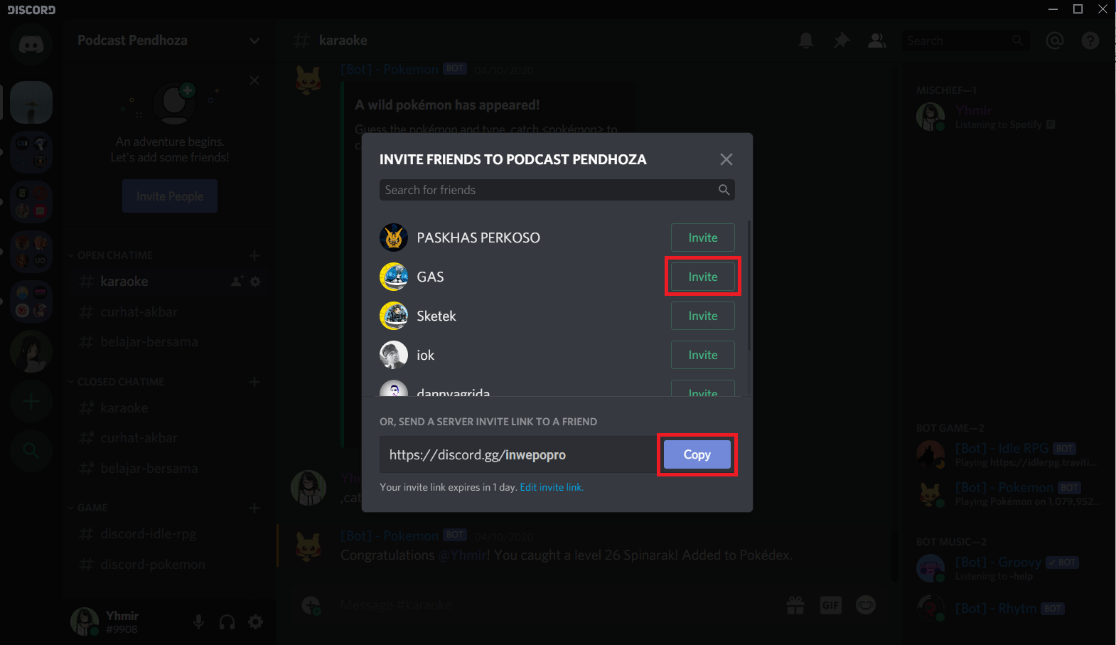 3. Ada dua pilihan invitasi yang ada disini. Yang pertama adalah menginvite teman secara langsung dengan mencari nama teman lalu memasukkan teman ke server tersebut. Atau melalui cara kedua dengan cara mengcopy link invitasi server tersebut dan memberikan ke teman. Jika teman masuk ke link tersebut maka akan muncul halaman untuk masuk ke server tersebut.