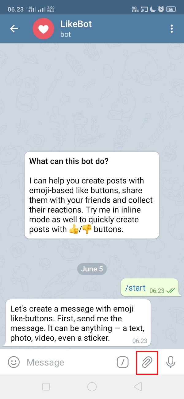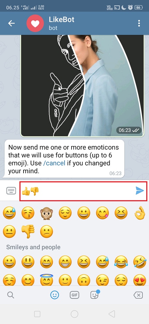 5. Kemudian Telegram akan minta dikirimkan ikon emoji, pilih emoji like dan emoji dislike, kemudian klik kirim.