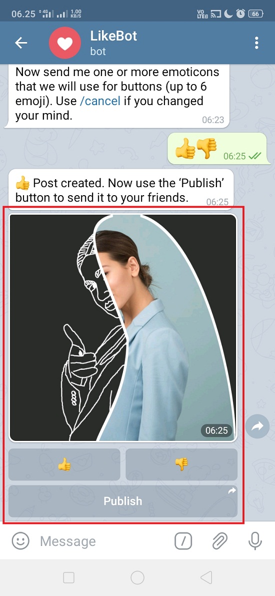 6. Pesan dengan tampilan tombol like dan dislike sudah selesai, klik link publish untuk mengirimkan pesan ke group atau channel yang ada di Telegram.