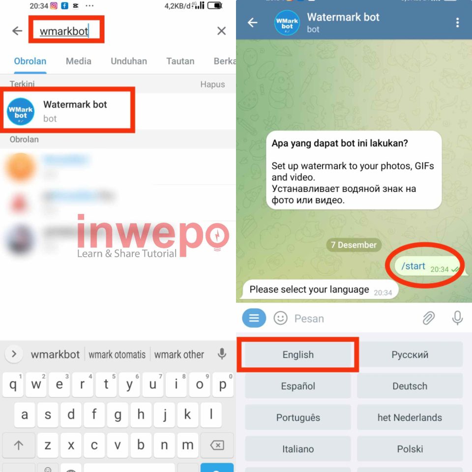 1. Buka aplikasi Telegram di smartphone kalian, lalu ketikkan di kolom pencarian @Wmarkbot pilih sesuai gambar. Selanjutnya masuk kedalam bot dan tap menu mulai atau /start, lalu pilih bahasa English.