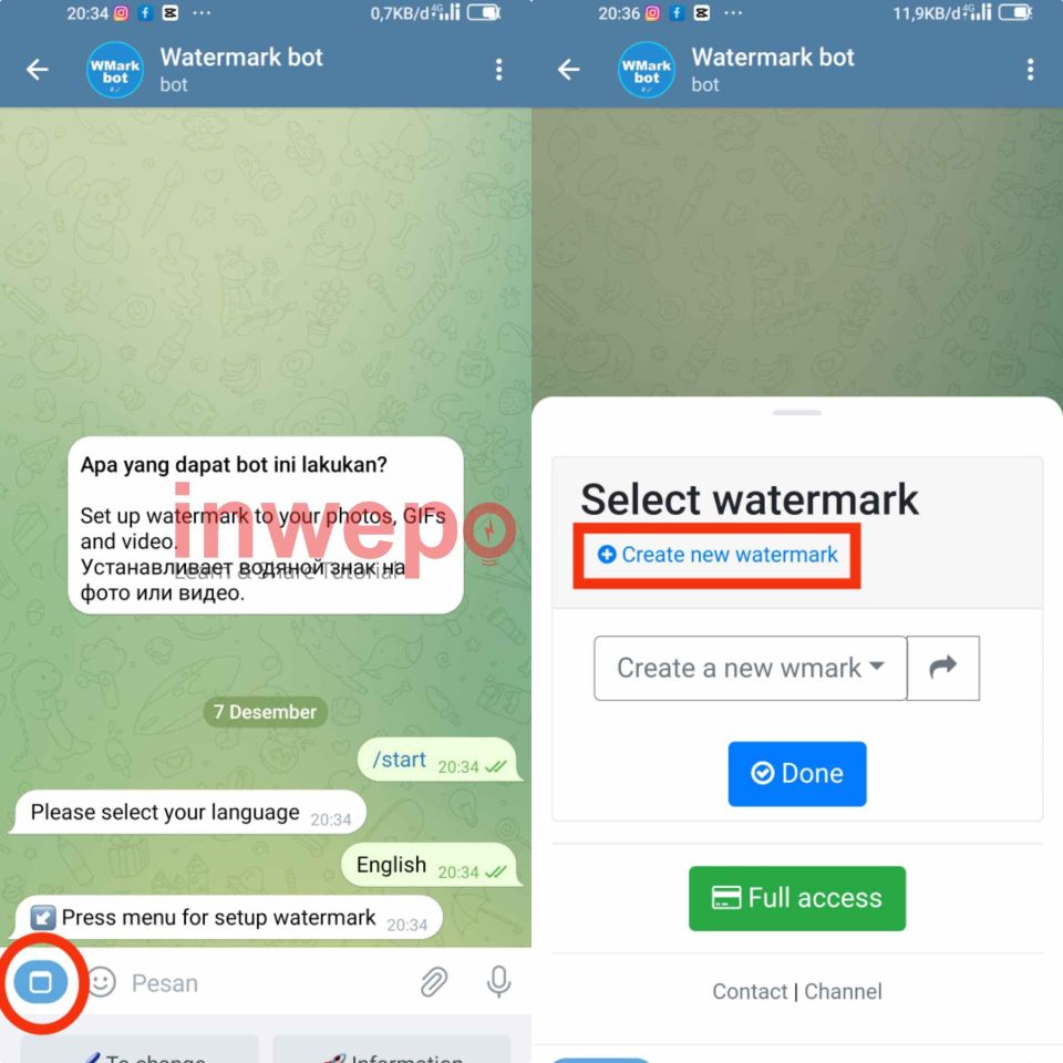 2. Tap icon kotak yang berada di pojok bawah untuk setting watermark. Tap menu Create new watermark.