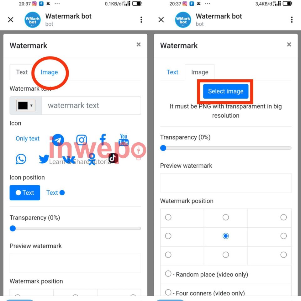 3. Karena kita akan menggunakan watermark tipe gambar jadi pilih menu Image. Tap Select Image untuk menambahkan gambar yang sudah kita persiapkan sebagai watermark nantinya.