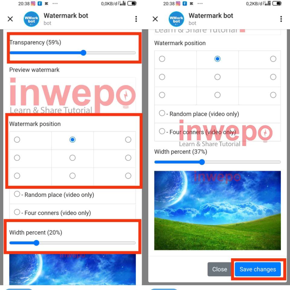 4. Atur transparansi watermark dengan menggeser menu slider transparency. Atur juga tata letaknya dengan menu Watermark Position. Atur size atau ukuran watermark dengan menu slider Width percent, kemudian tap menu Save Change.