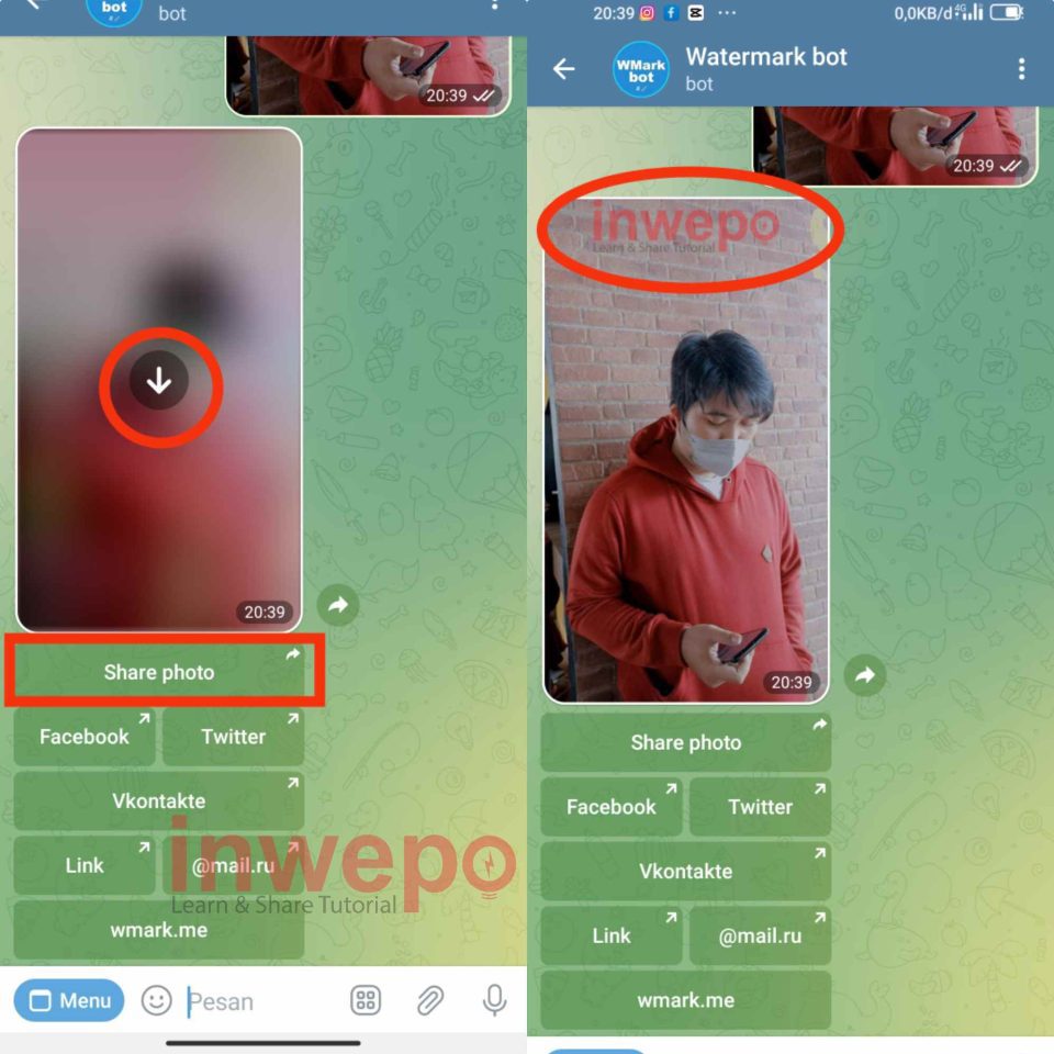 6. Bot otomatis akan langsung mengirimkan file photo yang sudah di beri Watermark. Kalian tinggal tap icon unduh atau juga bisa langsung membagikannya dengan tap menu share photo. Nah, tampilan gambar yang di beri watermark akan seperti di bawah ini, sesuai dengan settingan yang sudah kita lakukan sebelumnya.