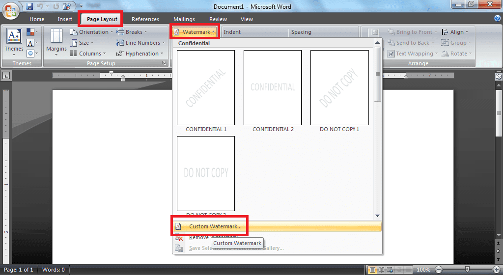 2. Sekarang, buka salah satu dokumen Ms.Word yang diberikan watermark logo. Klik menu Page Layout dan kemudian klik menu Watermark. Untuk bisa menambahkan watermark logo, klik menu Custom Watermark.