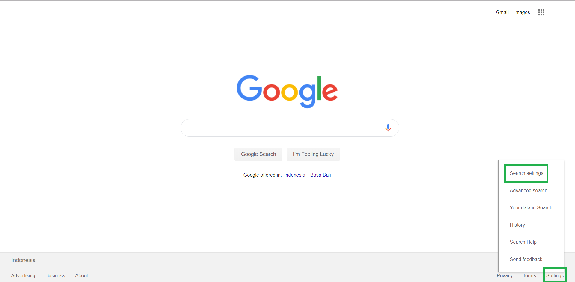 2. Klik Settings (Setelan) pada pojok kanan-bawah halaman Google, pilih Search Settings (Setelan Penelusuran).