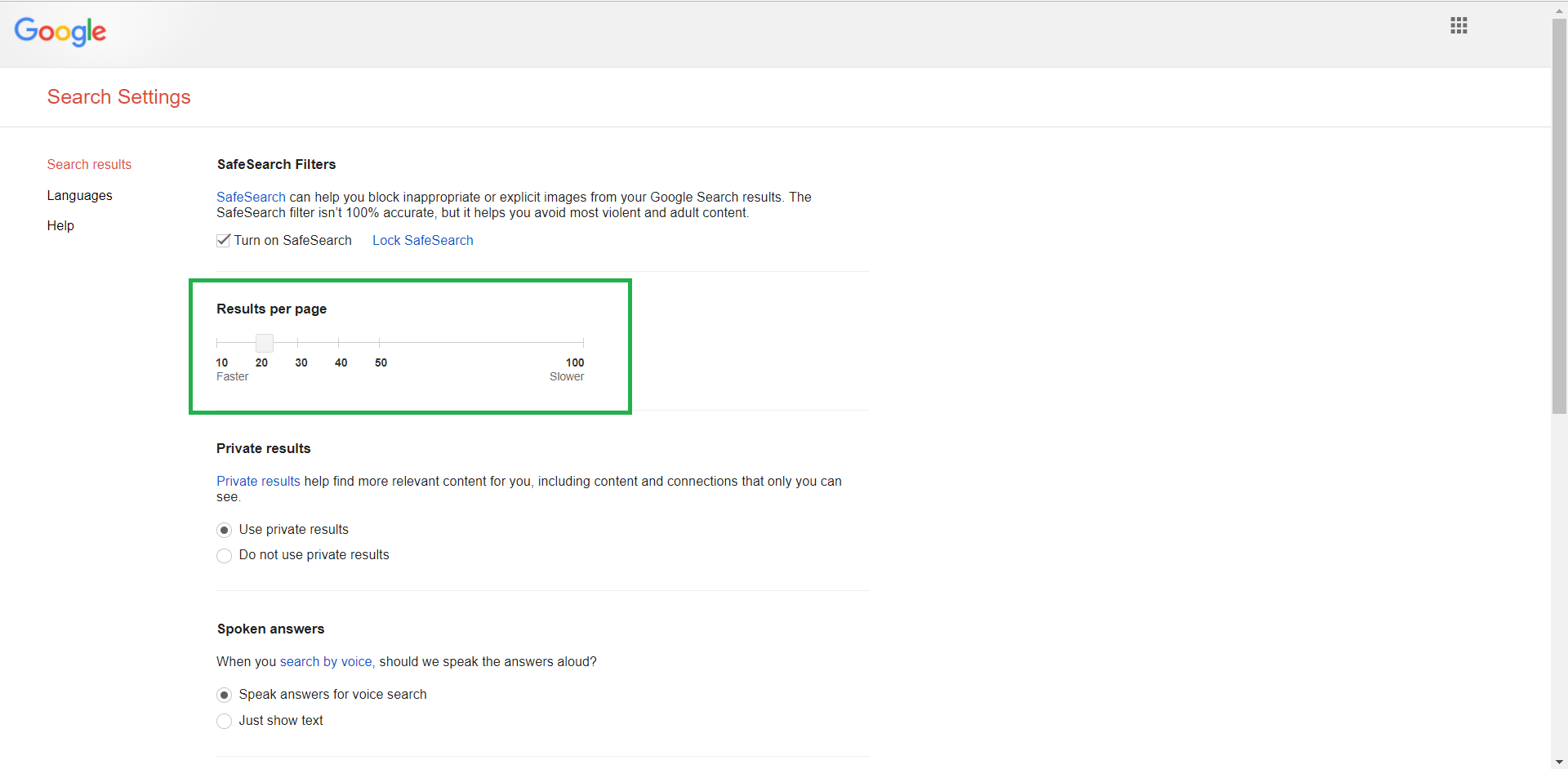 3. Pada bagian Results per page (Hasil per halaman), geser tombol persegi untuk menambah/mengurangi hasil penelusuran. Semakin banyak jumlah hasil penelusuran per halaman, semakin lambat loading yang akan dimuat per halaman, begitu pula sebaliknya.