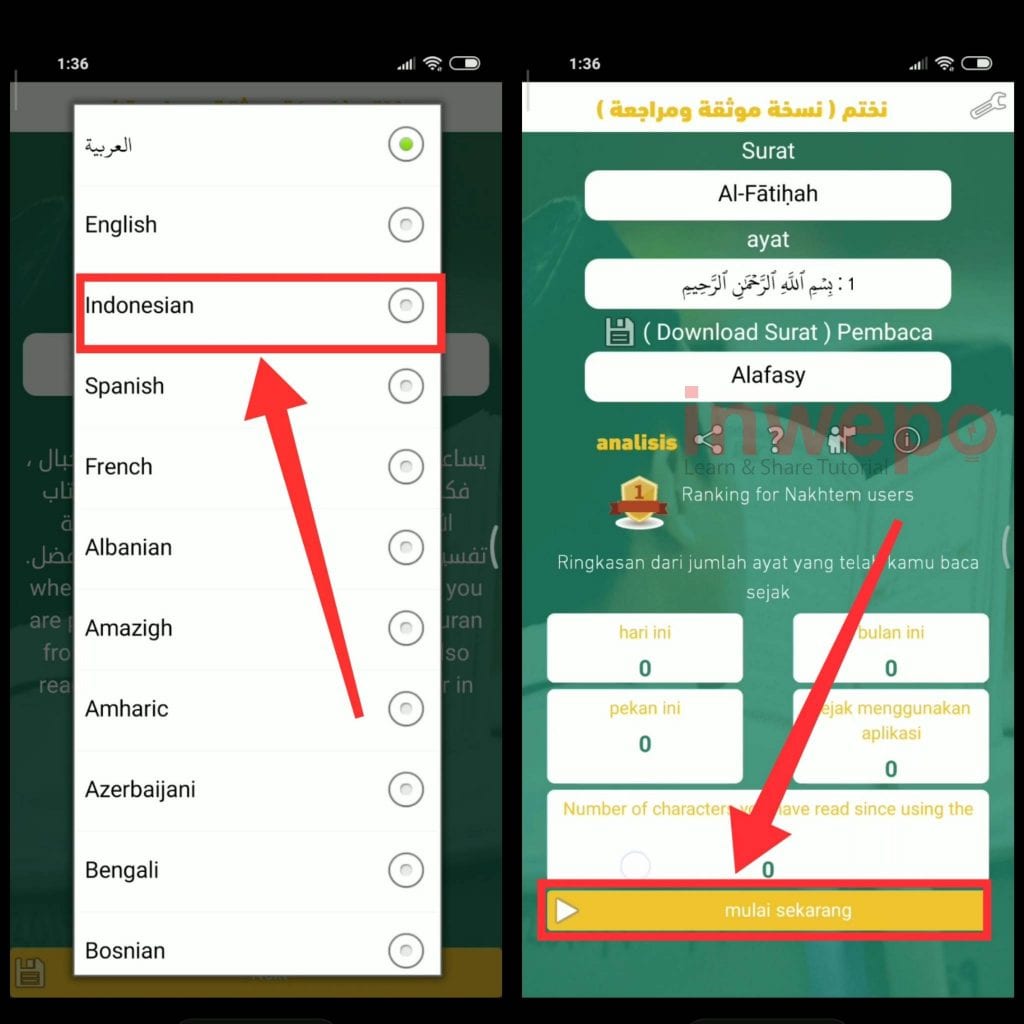 2. Buka aplikasi Nakhtim yang sudah terinstall kemudian pilih bahasa yang ingin kamu gunakan. Berikutnya jangan lupa memberi izin akses dan tap Mulai sekarang.