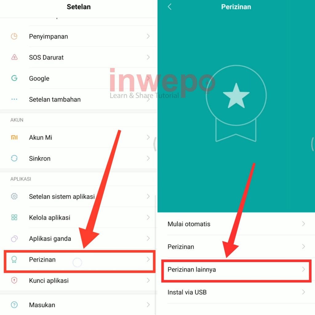 3. Buka menu Setelan lalu pilih menu Perizinan dan tap lagi Perizinan lainnya.
