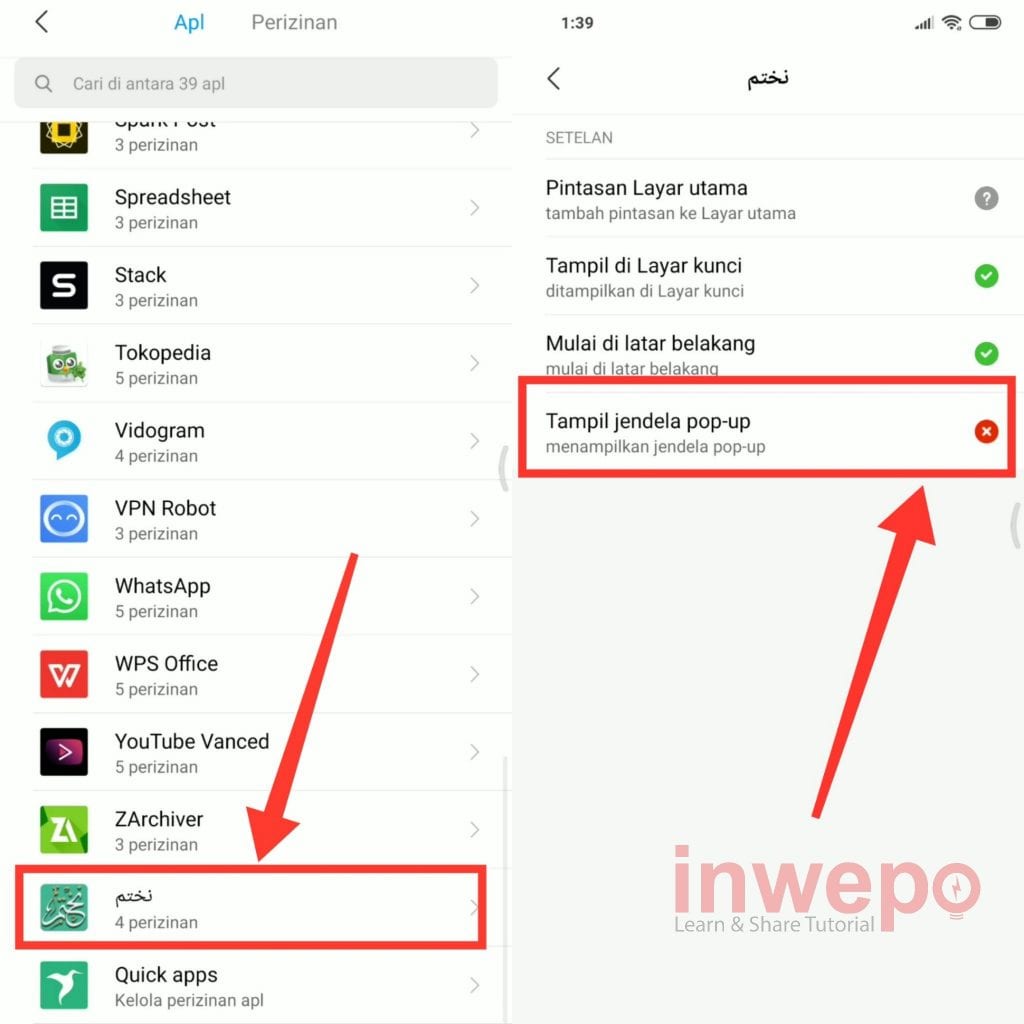 4. Cari aplikasi Nakhtim selanjutnya aktifkan menu tampil jendela pop up.