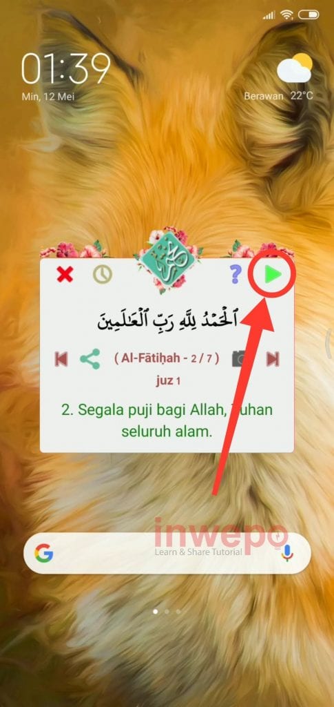 5. Coba matikan layar lalu hidupkan untuk mencoba aplikasi, kamu juga bisa mendengarkan murottal dari ayat yang kamu baca dengan tap tombol play.