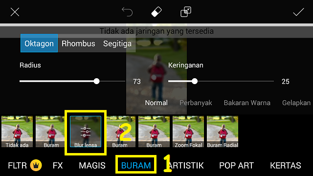 Pilih ‘FX’ – ‘Buram’ – ‘Blur Lensa’. Naikkan nilai ‘Radius’ 73, naikkan ‘Keringanan’ menjadi 25. Klik centang.