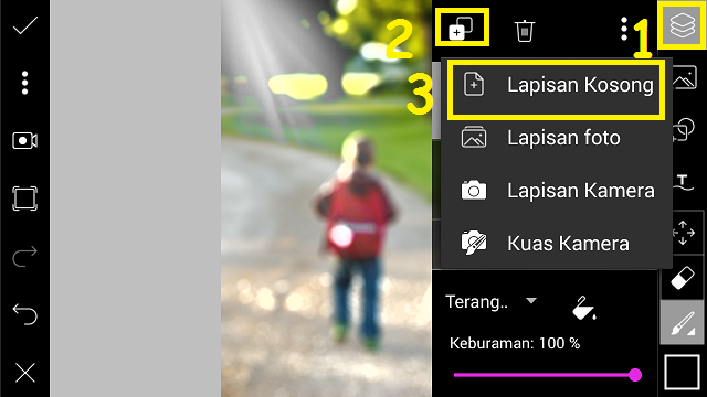 8. Agar gambar foto terlihat, pilih ‘Lapisan’ – ubah pengaturan normal menjadi terangkan.