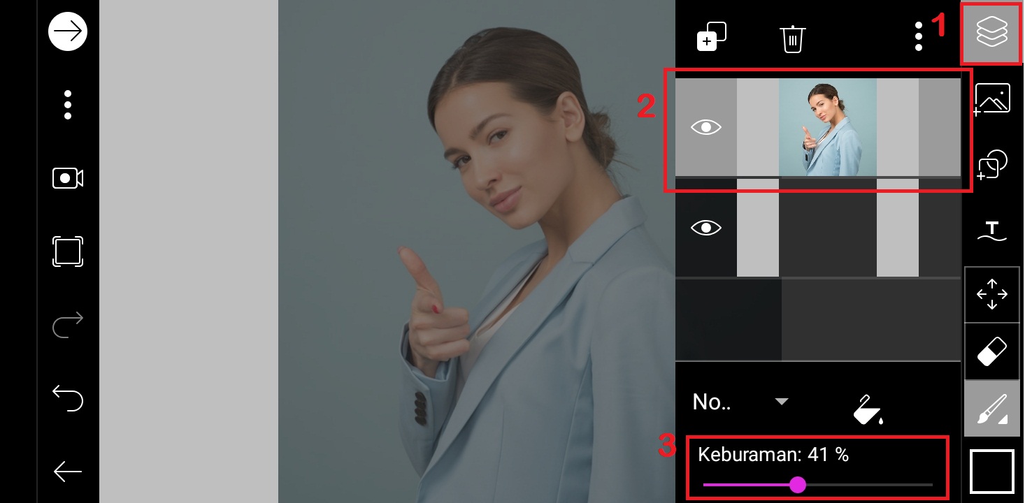 10. Klik ‘Lapisan’ – pilih ‘Lapisan Foto’ – kurangi nilai keburaman menjadi 41%.