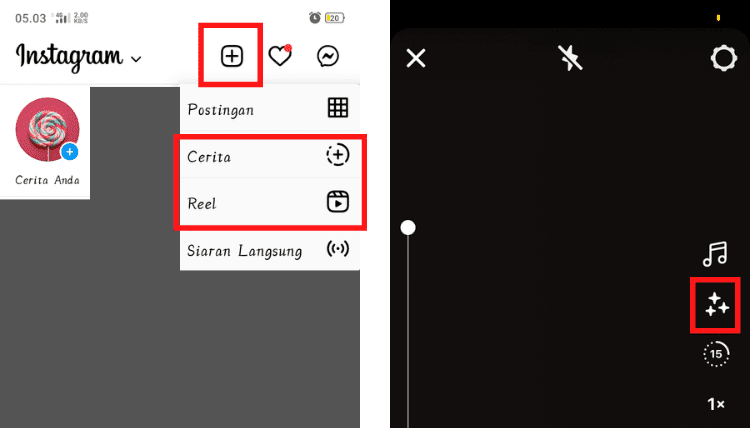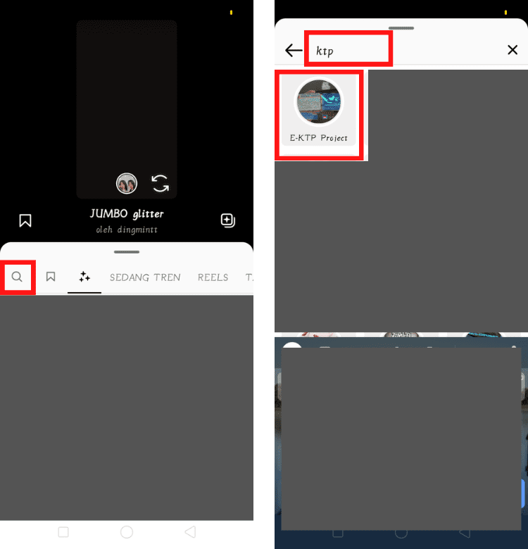 3. Sebelum membuat video, cari efek yang bernama E-KTP Project untuk bisa menampilkan hologram e-KTP di video. Tekan menu Efek di Reels Instagram atau tekan menu Searching di Story Instagram.