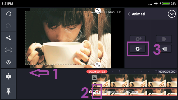 8. Sekarang kita akan membuat efek shake-nya. Untuk mulai pilih waktu durasi – klik tanda ‘+’ – geser gambar kearah kiri – klik tanda ‘–’ untuk berhenti.