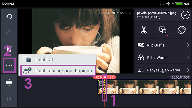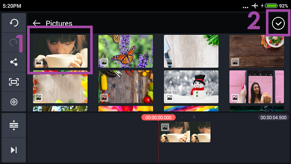 5. Untuk memudahkan memberi efek shake di video, lebarkan foto, tetapi dengan durasi yang sama. Caranya kamu hanya perlu menggunakan dua jari yang digeser keluar.
