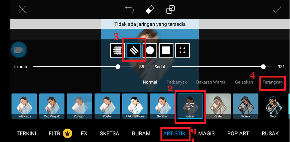 Pilih ‘Artistik’ – pilih ‘Geser’ – pilih ‘Garis Tiga’ – ubah pengaturan dari normal menjadi terangkan – klik icon ‘Hapus’.