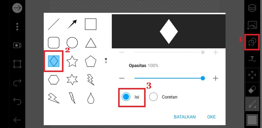 7. Pilih ‘Snape’ – disini kamu bebas memilih bentuk, tapi saya akan pilih bentuk layang-layang – klik checkbox ‘Isi’ – klik oke.
