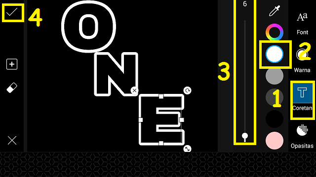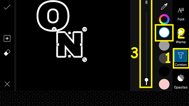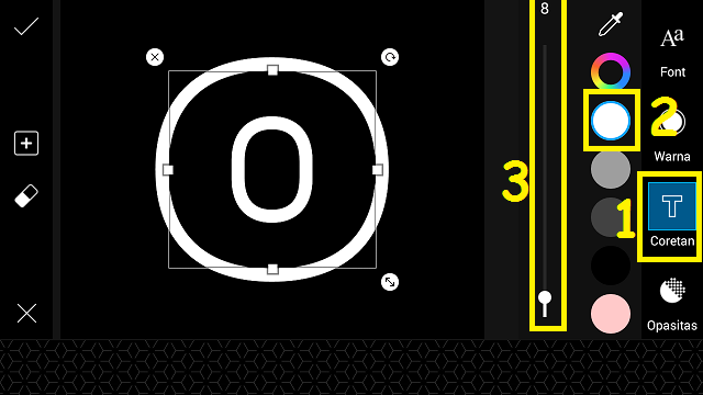 Beri ‘Coretan’ pada huruf, pilih warna putih, dan kurangi tebal coretan. Posisikan huruf O.