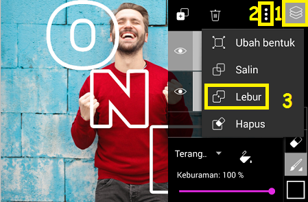 11. Gabungkan foto objek, dan foto teks, dengan pilih ‘Lapisan’ – tiga titik – ‘Lebur’.