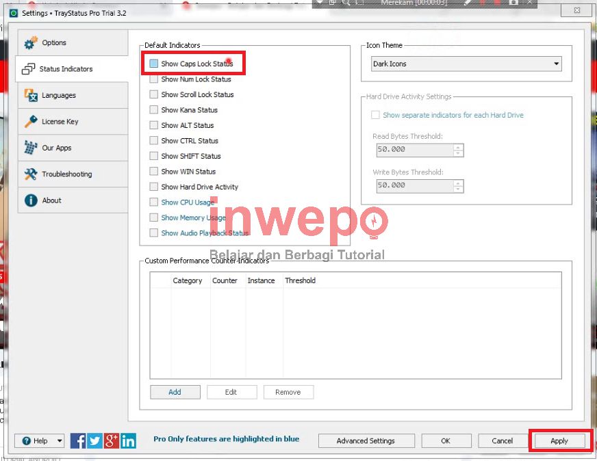 2. Lalu buka aplikasi tersebut, jika aplikasi sudah terbuka, kamu aktifkan atau centang pada checkbox Show caps lock status dan kamu bisa atur tema status status caps lock tersebut dan kamu klik tombol Apply.