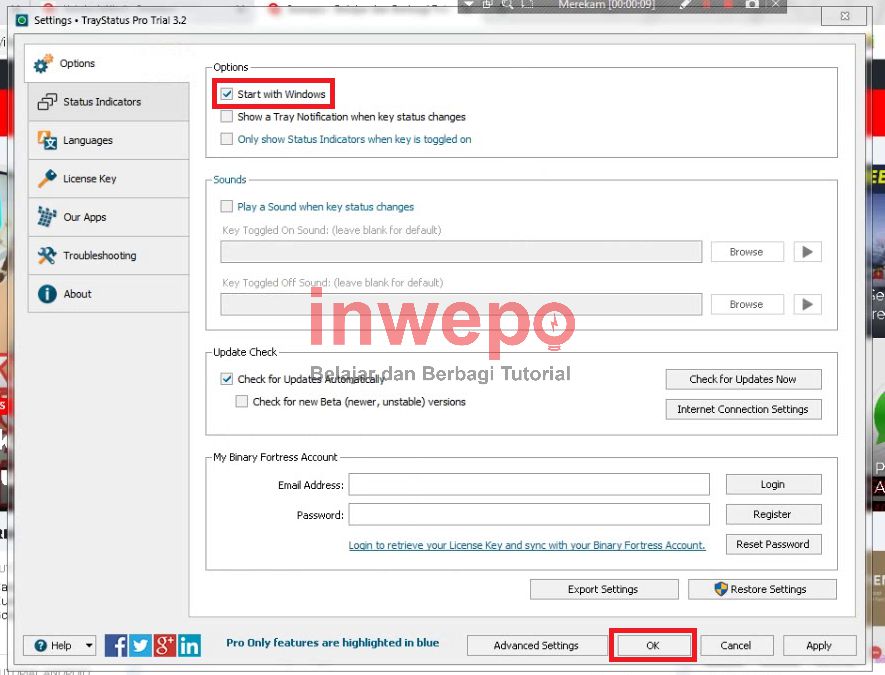 3. Lalu kamu tap pada menu Option dan kamu aktifkan atau beri centang pada checkbox Start with windows dan kamu klik tombol OK.