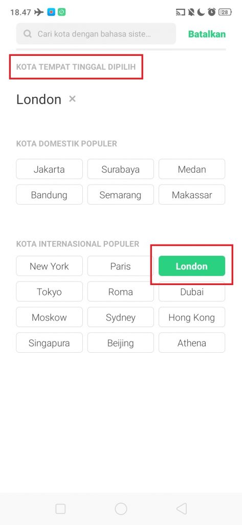 5. Di ‘Tempat Tinggal’, kita bisa memilih kota. Klik panah samping untuk memilih.