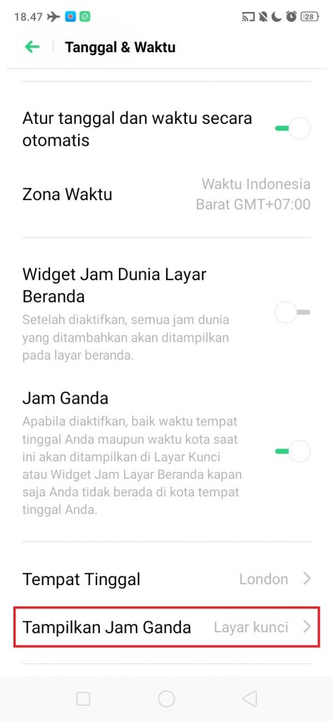 6. Di ‘Tampilan Jam Ganda’ untuk memilih dimana jam ganda mau ditampilkan.