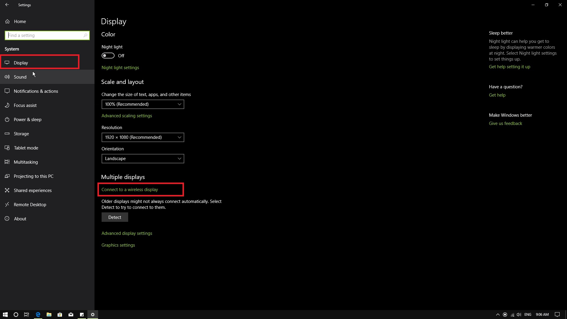 2. Di dalam menu system terdapat banyak tab yang bisa kamu pilih di sebelah kiri layar. Pilih tab Display dan klik pada tulisan Connect to a wireless display.