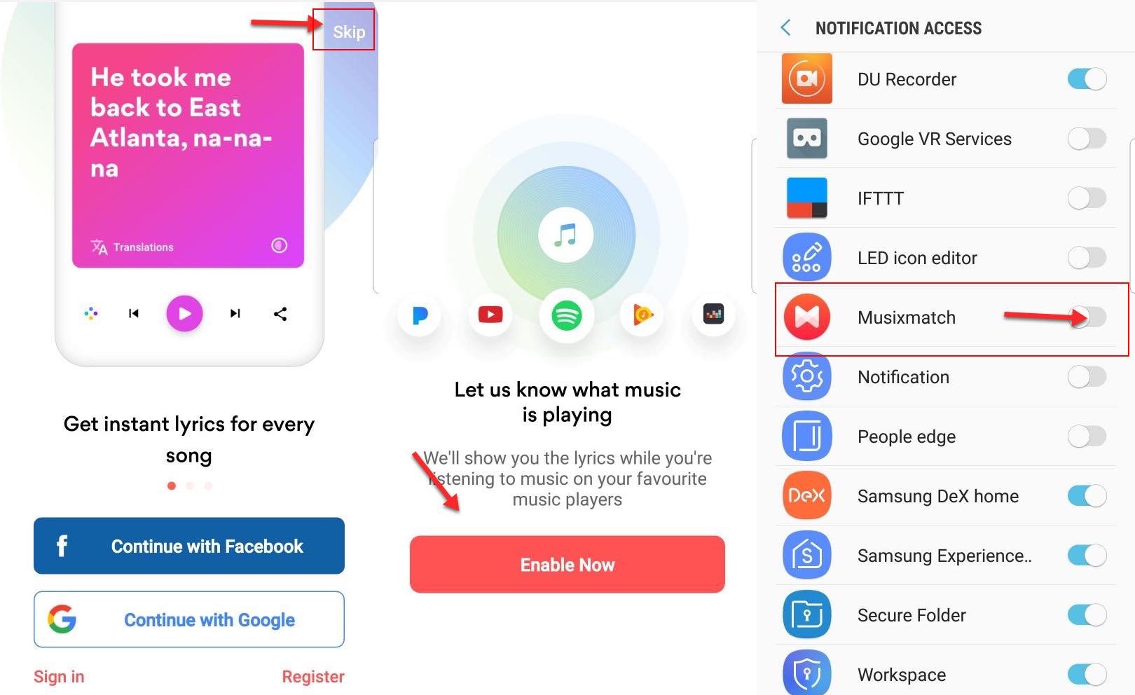 3. Selanjutnya tap Enable Now, lalu berikan semua izin akses Musicmatch untuk layar pop-up dan notifikasi.