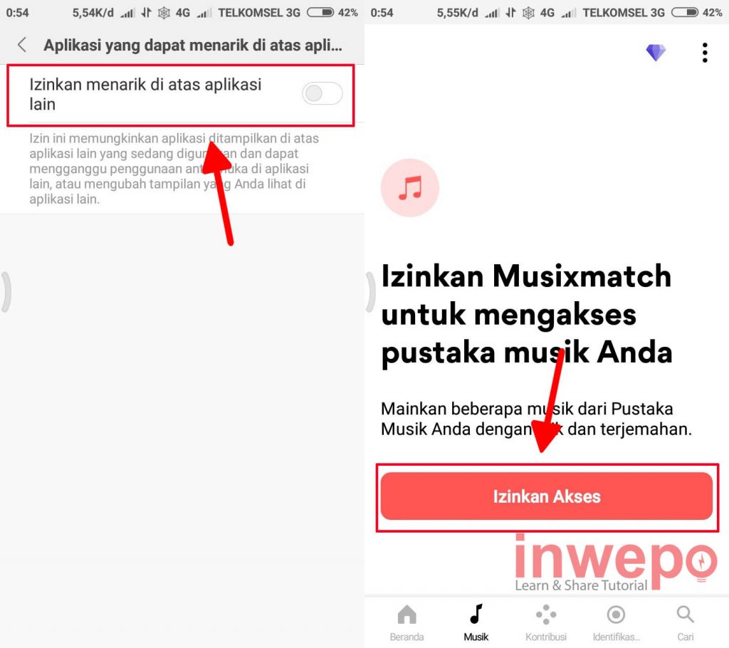 3. Tap Izinkan menarik diatas aplikasi lain lalu beri izin akses pada Musixmatch untuk mengakses musik yang ada di smartphone dengan tap Izinkan Akses.