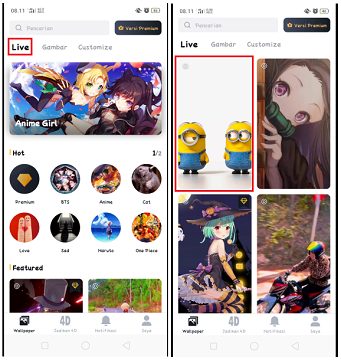 2. Pilih menu Live, untuk melihat-lihat live wallpaper yang sudah disediakan oleh aplikasi. Kemudian pilih salah satu live wallpaper yang sudah tersedia di aplikasi ini. Ada dua pilihan live wallpaper di aplikasi ini yaitu versi gratis dan versi bebayar. Versi berbayar ditandai dengan ikon permata di pojok kanan atas wallpaper.
