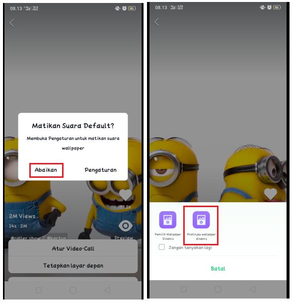 4. Akan muncul kotak konfirmasi apakah kamu ingin mematikan suara live wallpaper tersebut? Bila tidak, pilih abaikan dan kemudian pilih pratinjau wallpaper dinamis untuk melihat preview tampilan live wallpaper di HP Android kamu nantinya.